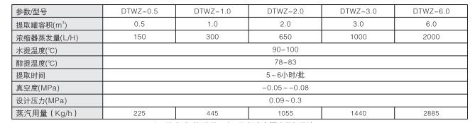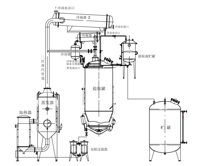 本設(shè)備主要由提取罐、外循環(huán)單效濃縮器及其他附屬設(shè)備組成,結(jié)構(gòu)緊湊,操作方便,集提取、濃縮、溶劑回收于一體。